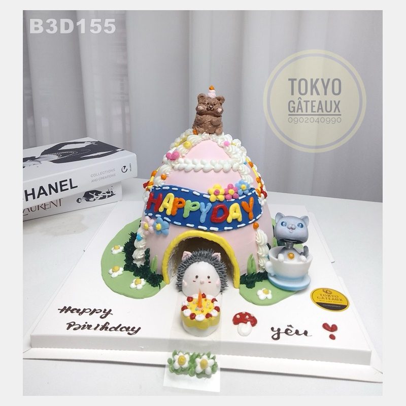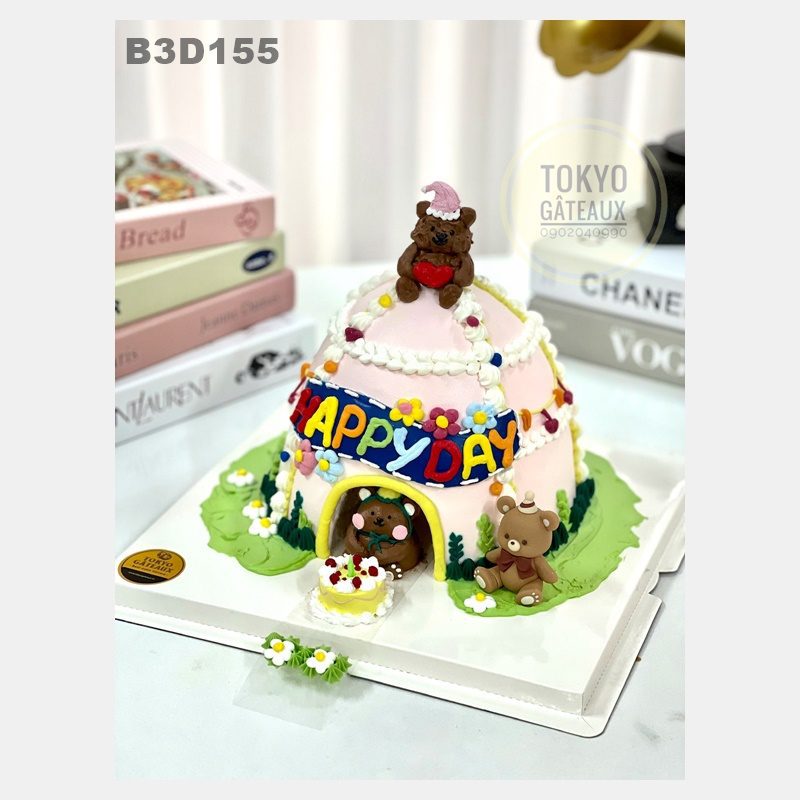 Bánh sinh nhật 3 Chú Gấu Con tạo hình ngôi nhà với 3 chú gấu. Điểm nhấn của chiếc bánh là chú gấu có thể di chuyển ra vào ngôi nhà.