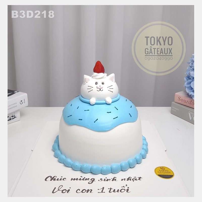 _ Bánh cốt vani, kem tươi, trang trí mèo 3D.