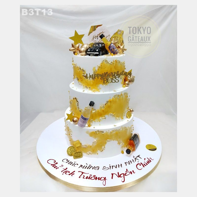 Bánh sinh nhật Oto sang trọng được trang trí oto đồ chơi sang trọng với tone màu vàng hiện đại.