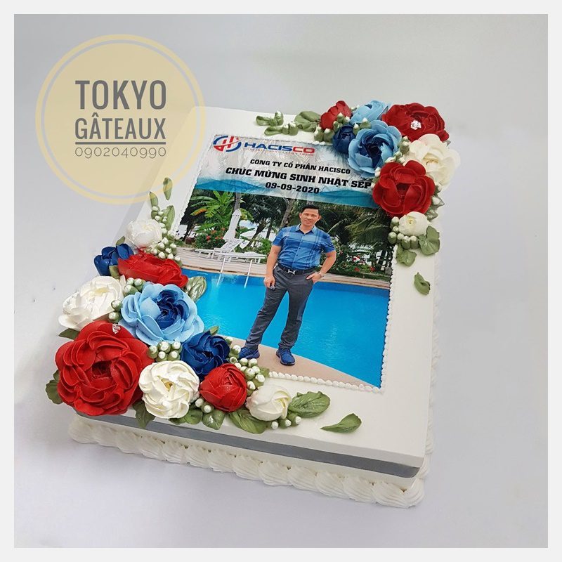 Bánh sinh nhật vuông hoa kem tươi Hacisco phù hợp với tiệc tại nhà hàng, tiệc sinh nhật đông người cần làm bánh, đẹp, hoành tráng