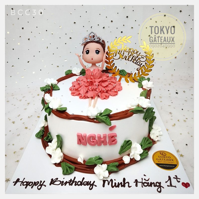 _ Bánh cốt vani, kem tươi, trang trí búp bê.