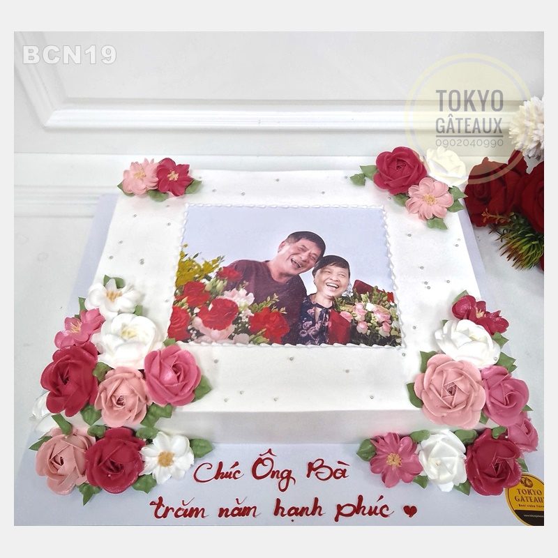 _ Bánh cốt vani, kem tươi, trang trí hoa kem tươi, in ảnh theo yêu cầu.