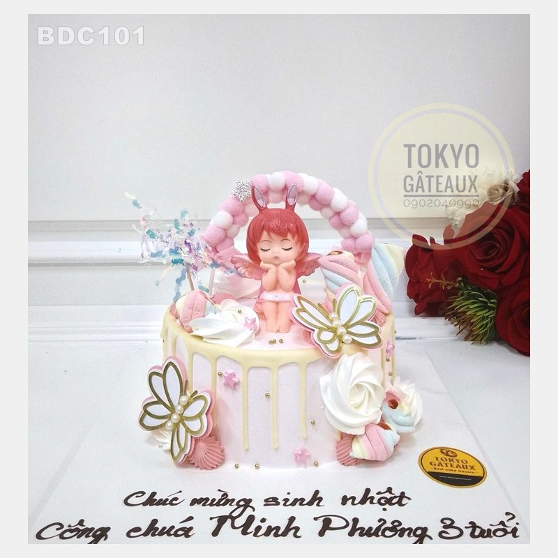 _ Bánh cốt vani, kem tươi, trang trí búp bê tóc hồng, bươm bướm.