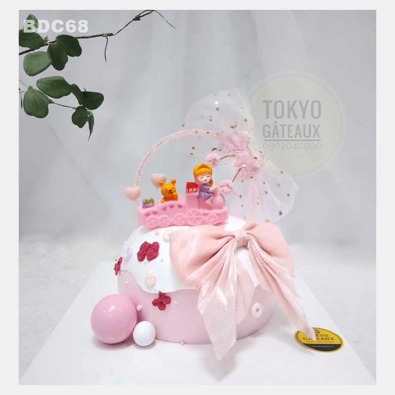 Bánh sinh nhật Lovely Train được trang trí búp bê đồ chơi với điểm nhấn là chiếc nơ hồng lấp lánh, phù hợp với các bé gái.