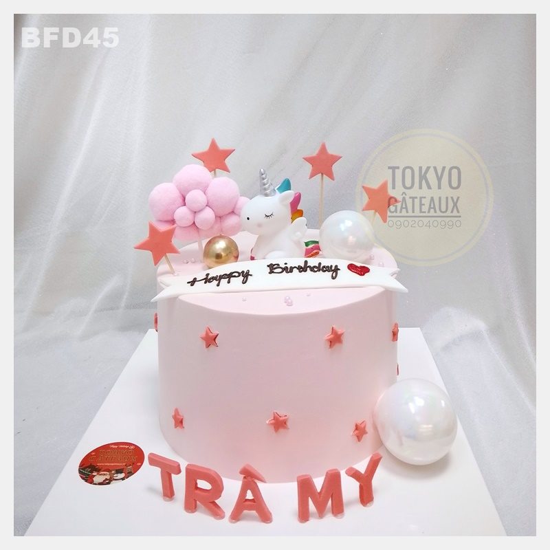 _ Bánh cốt vani, kem tươi, trang trí kì lân cầu vồng.