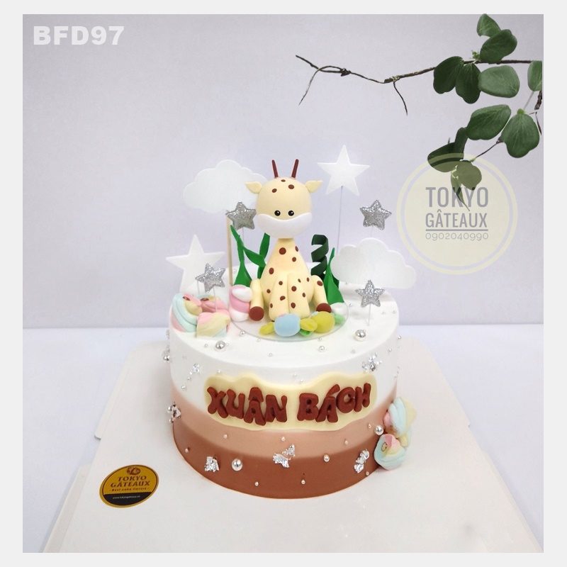 Bánh sinh nhật Hươu Cao Cổ được trang trí chú hươu cao cổ được nặn từ fondant. Chiếc bánh phù hợp với lễ thôi nôi, sinh nhật của các bé.