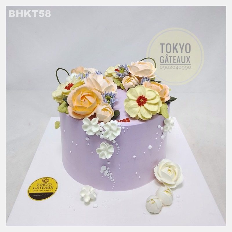 Bánh sinh nhật Vườn Hoa Tím được trang trí hoa kem tươi vô cùng tỉ mỉ và tinh tế, tạo nên sự nhẹ nhàng và thanh lịch cho chiếc bánh.