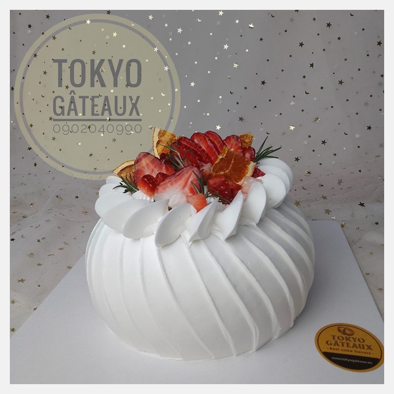 _ Bánh cốt vani, kem tươi, trang trí dâu tây tươi.
