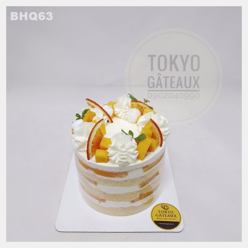 _ Bánh cốt vani, kem tươi, trang trí cam tươi, xoài tươi.