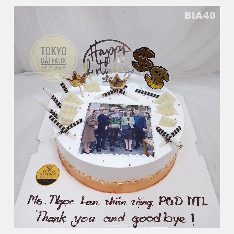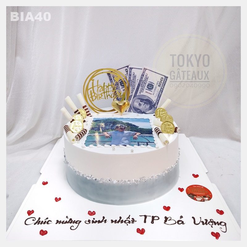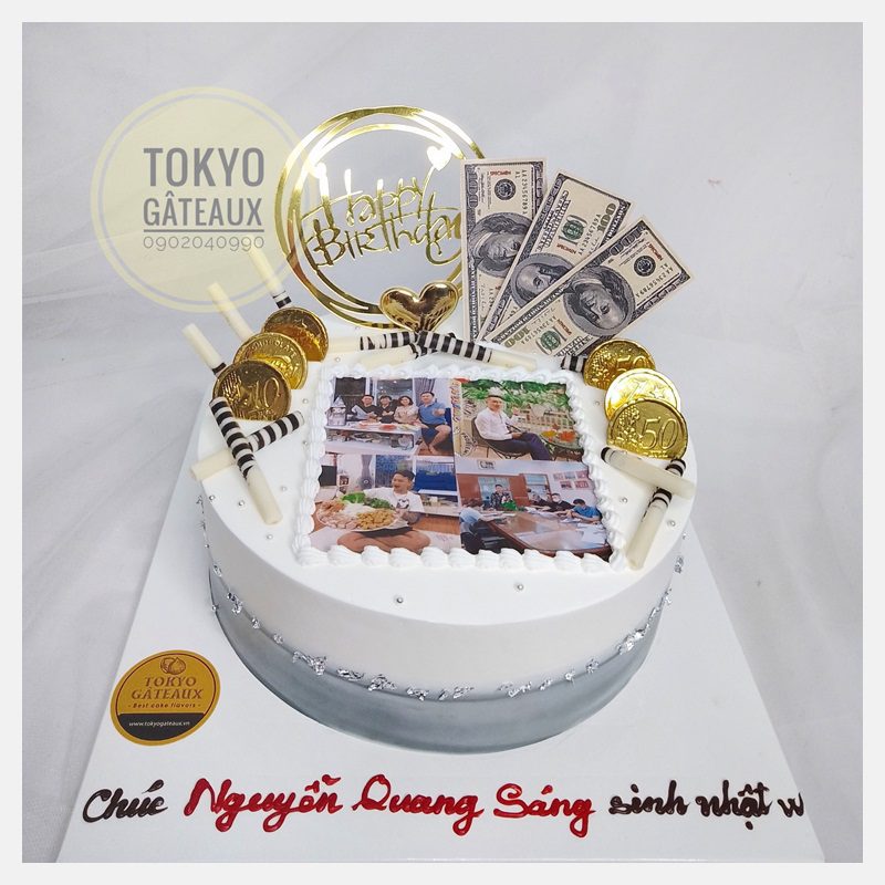 _ Bánh cốt vani, kem tươi, trang trí tiền đô, tiền vàng, in ảnh theo yêu cầu.