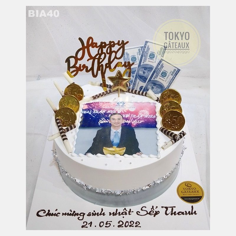 Bánh sinh nhật In ảnh đại gia in ảnh theo yêu cầu của khách hàng, trang trí hiện đại với tiền đô la và tiền vàng khiến chiếc bánh trở nên vô cùng sang trọng.