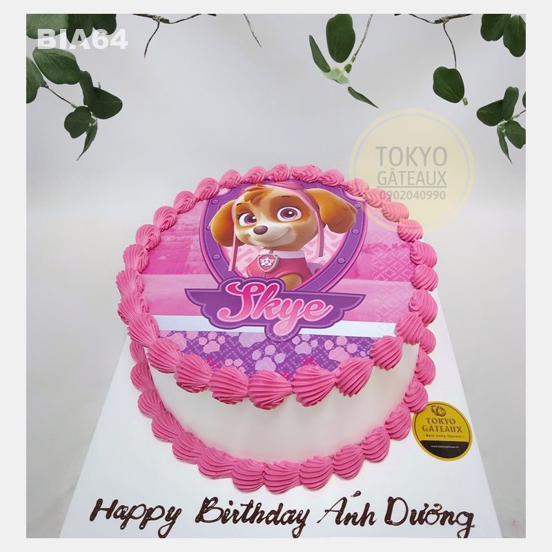 Bánh sinh nhật Skye trang trí tone màu hồng và in ảnh theo yêu cầu của khách hàng.