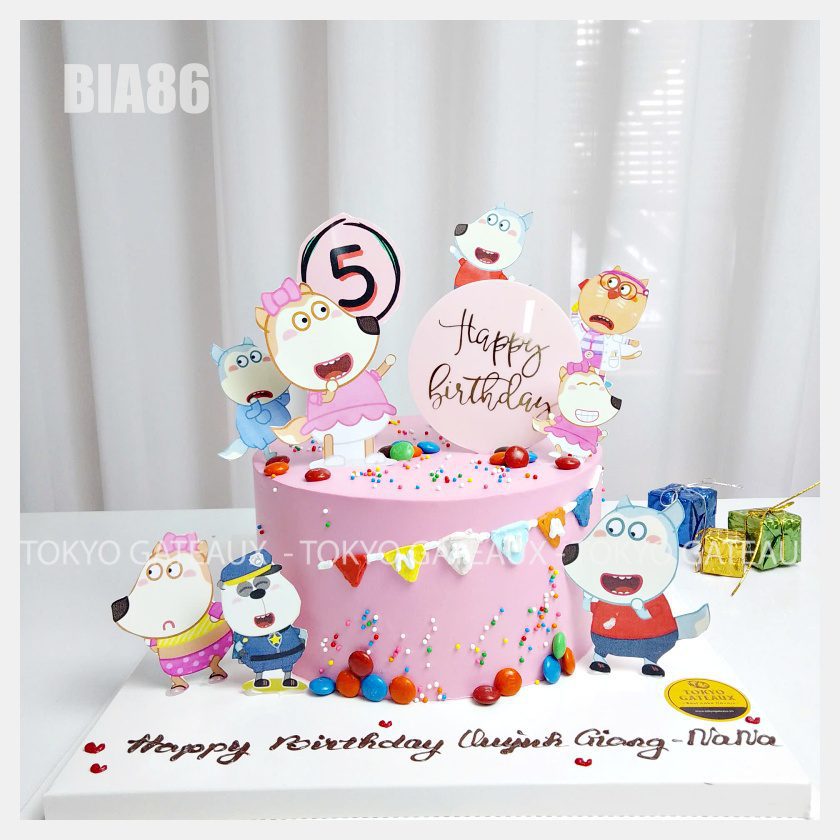 Chiếc bánh sinh nhật Gia Đình Wolfoo với thiết kế đáng yêu, lấy cảm hứng từ bộ phim hoạt hình Wolfoo, màu sắc tươi sáng và trang trí tỉ mỉ.