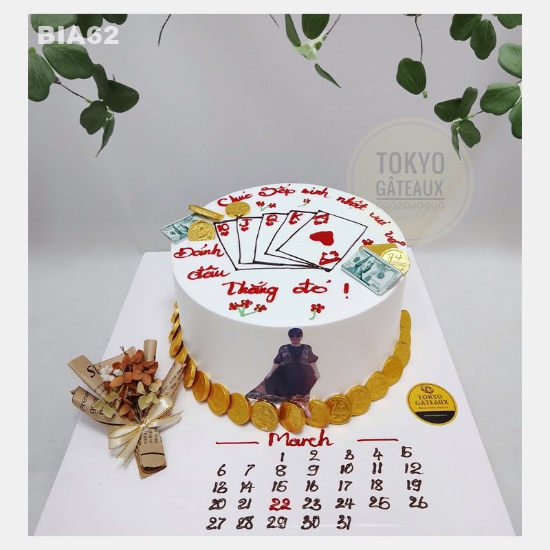 _ Bánh cốt vani, kem tươi, trang trí lá bài, tiền vàng.