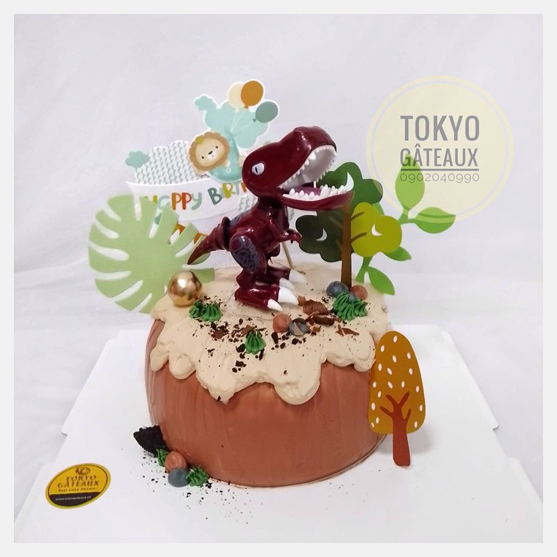 _ Bánh cốt vani, kem tươi, trang trí khủng long T-rex.