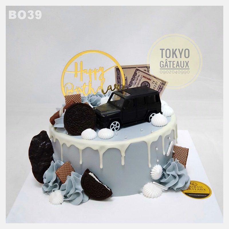 _ Bánh cốt vani, kem tươi, trang trí xe Mercedes đồ chơi.