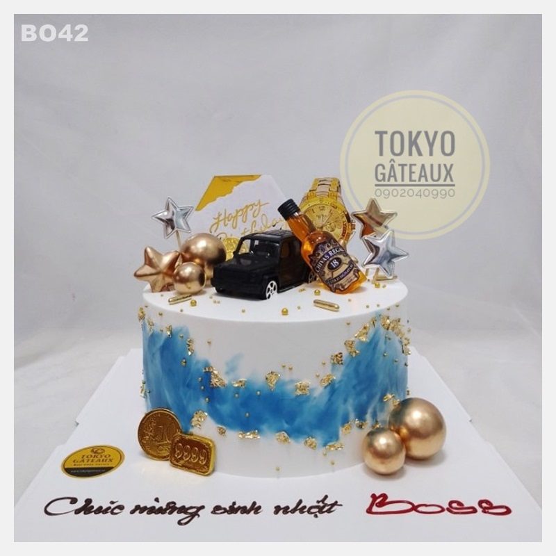 _ Bánh cốt vani, kem tươi, trang trí oto đồ chơi, chai rượu đồ chơi.
