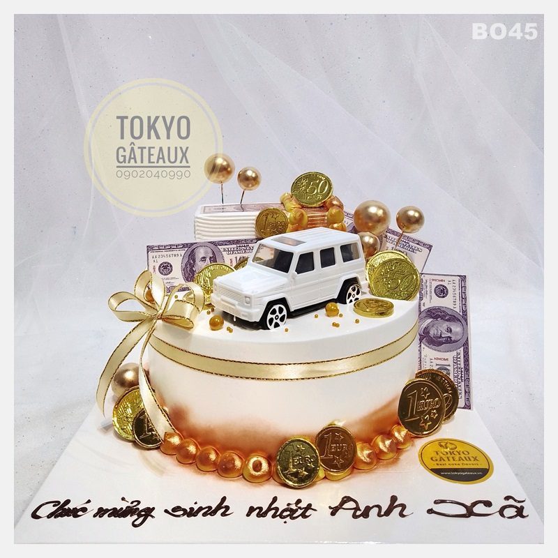 _ Bánh cốt vani, kem tươi, trang trí oto, tiền vàng.