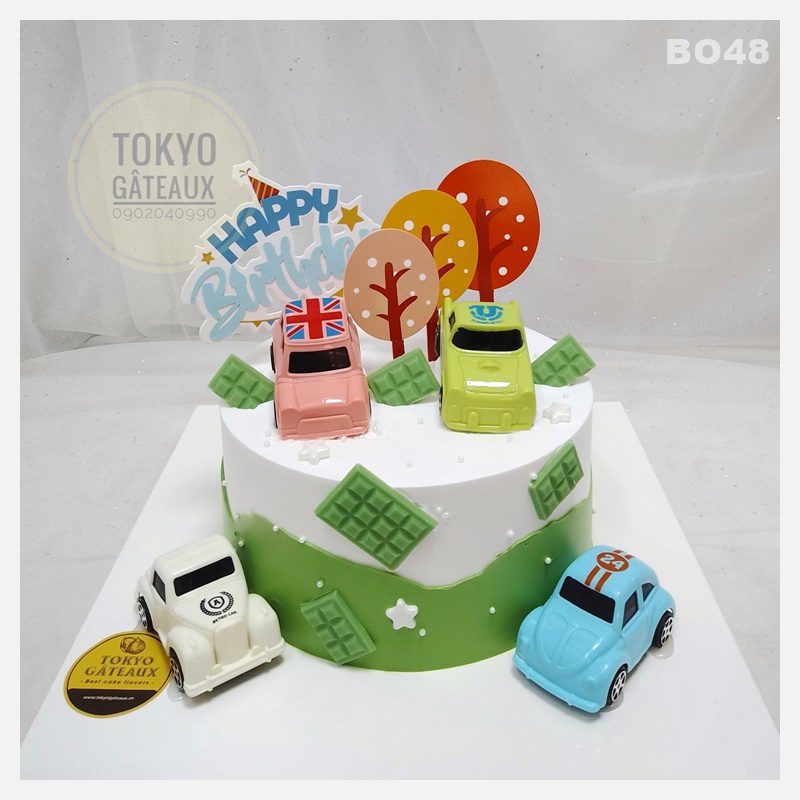 _ Bánh cốt vani, kem tươi, trang trí oto đồ chơi.