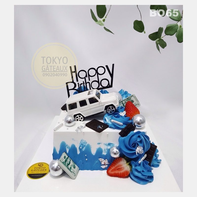 _ Bánh cốt vani, kem tươi, trang trí dâu tây tươi, oto đồ chơi.