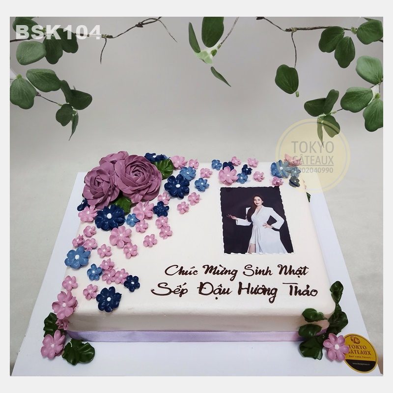 Bánh sinh nhật Bông Tím trang trí hoa kem tím và in ảnh theo yêu cầu của khách hàng.
