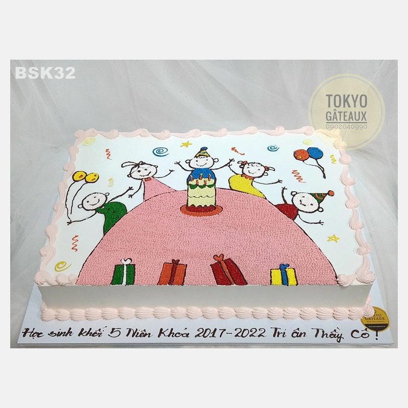 _ Bánh cốt vani, kem tươi, vẽ hình bạn nhỏ vui đùa bên bàn tiệc.