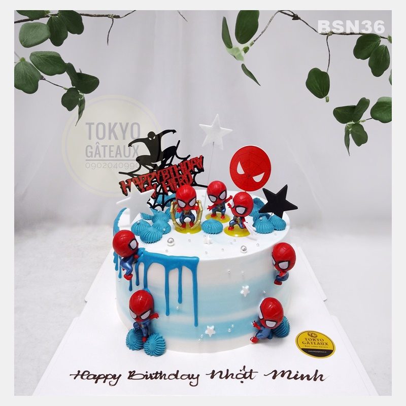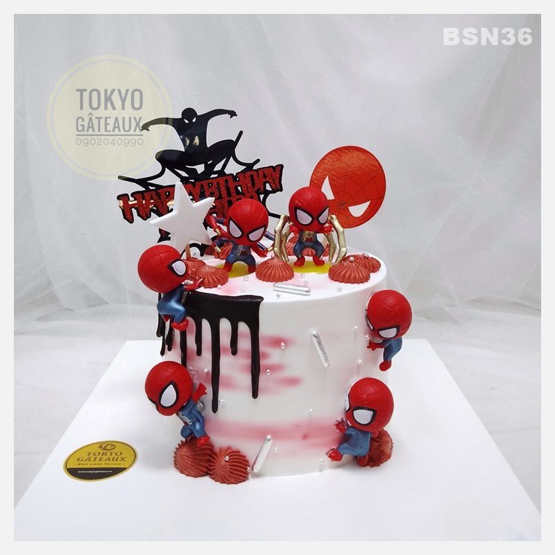 _ Bánh cốt vani, kem tươi, trang trí người nhện chibi.