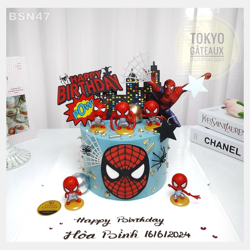 _ Bánh cốt vani, kem tươi, trang trí người nhện chibi.
