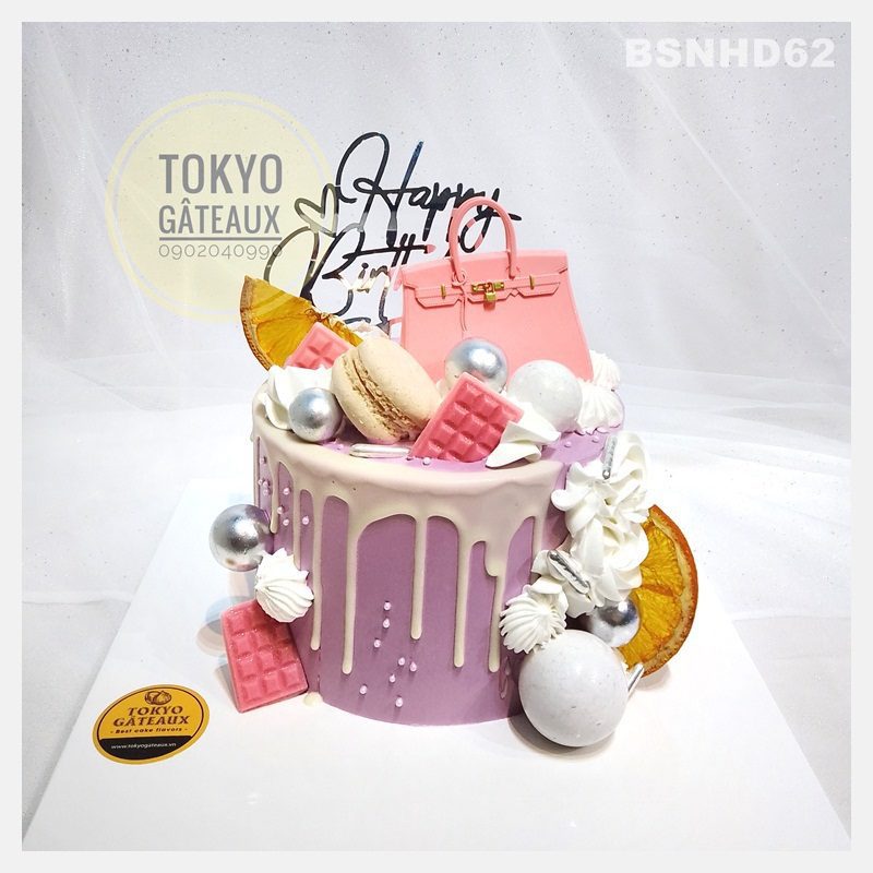 _ Bánh cốt vani, kem tươi, trang trí túi xách, socola, macaron.