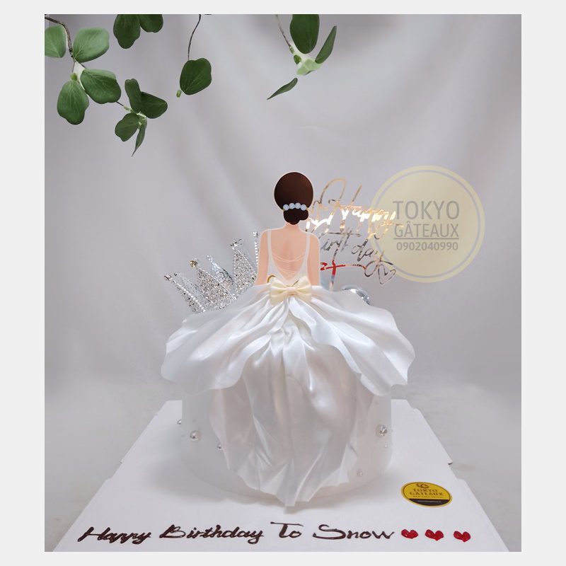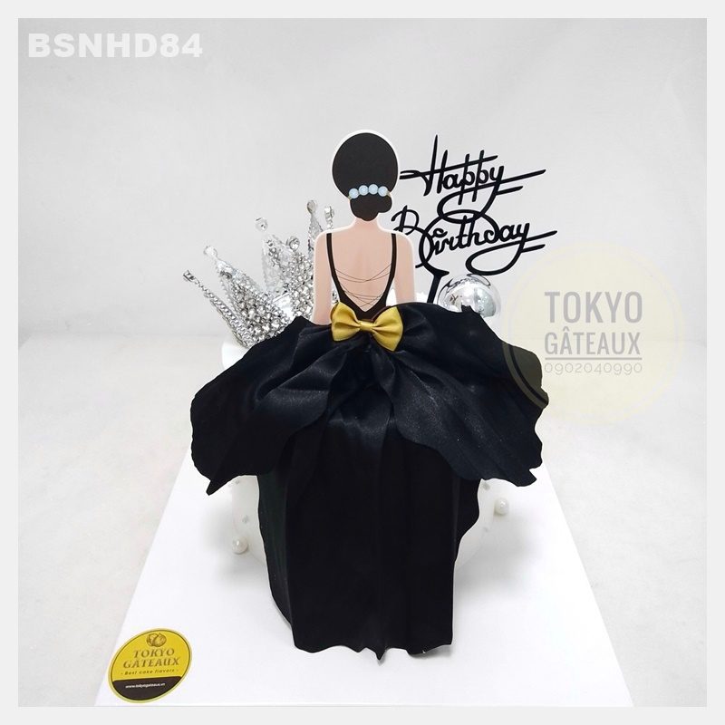 _ Bánh cốt vani, kem tươi, trang trí cô gái váy lụa đen.