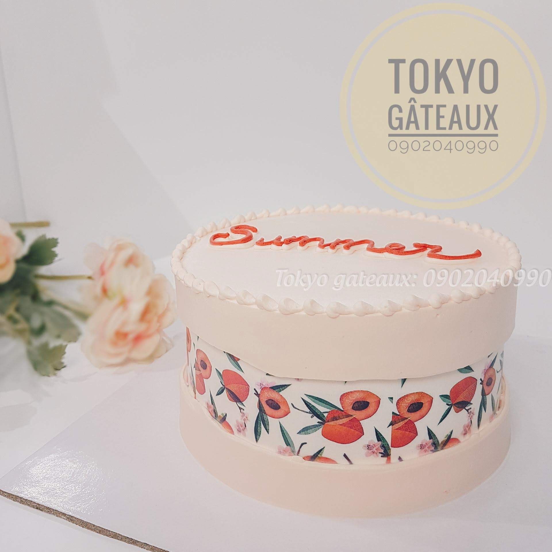 _ Bánh đi kèm hộp có tên, địa chỉ, sđt của công ty được in trên vỏ hộp, đế bánh có dán logo “Tokyo Gâteaux” màu vàng.