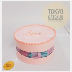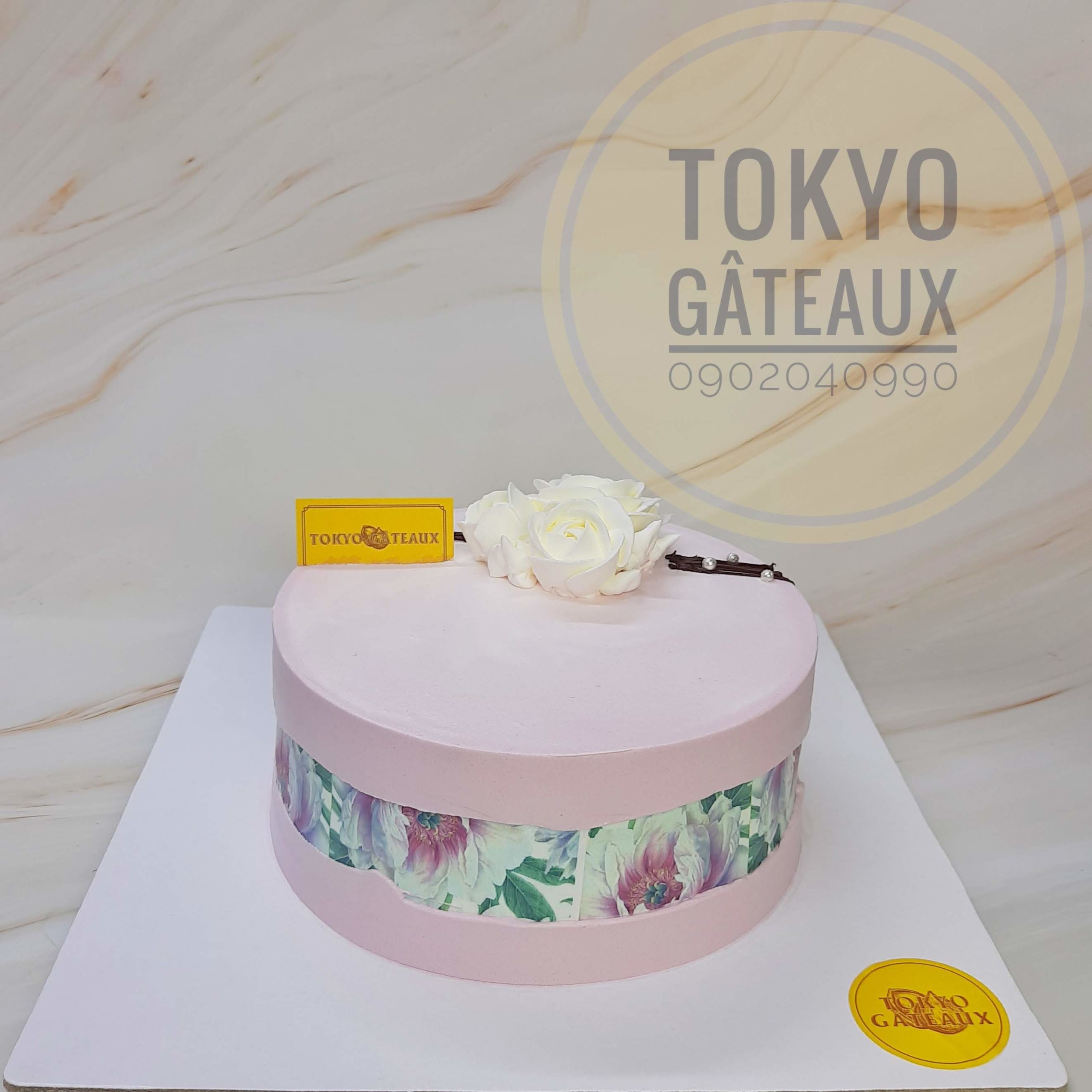 _ Bánh đi kèm hộp có tên, địa chỉ, sđt của công ty được in trên vỏ hộp, đế bánh có dán logo “Tokyo Gâteaux” màu vàng.