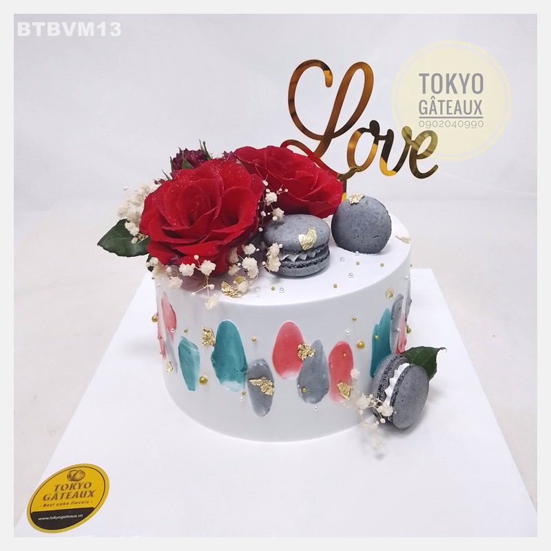 _ Bánh cốt vani, kem tươi, trang trí hoa hồng tươi, macaron.