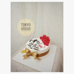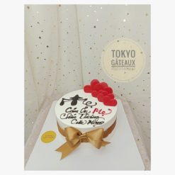 _ Bánh đi kèm hộp có tên, địa chỉ, sđt của công ty được in trên vỏ hộp, đế bánh có dán logo “Tokyo Gâteaux” màu vàng.
