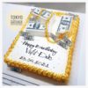 _ Bánh đi kèm hộp có tên, địa chỉ, sđt của công ty được in trên vỏ hộp, đế bánh có dán logo “Tokyo Gâteaux” màu vàng.
