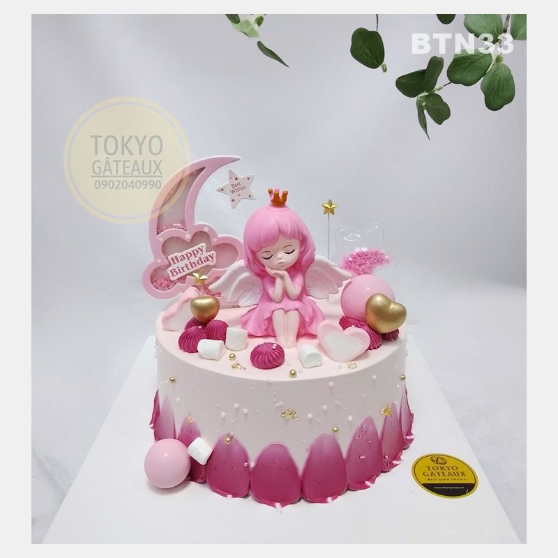 _ Bánh cốt vani, kem tươi, trang trí búp bê hồng, trăng hồng.