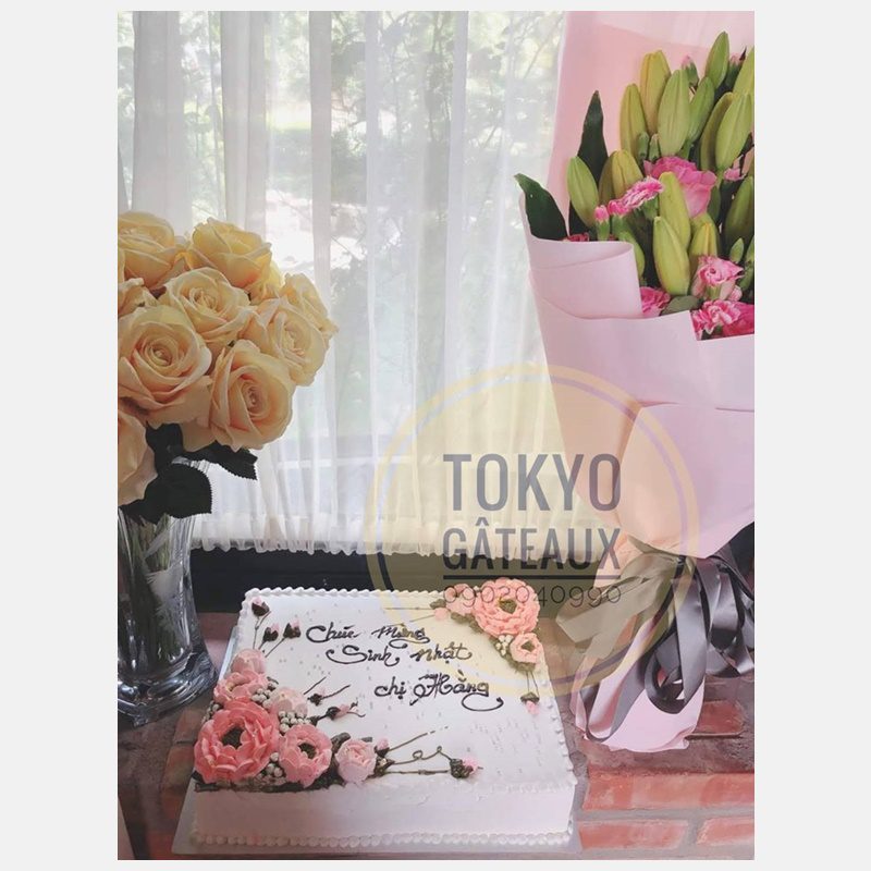 Bánh sinh nhật vuông hoa kem tươi phù hợp với tiệc tại nhà hàng, tiệc sinh nhật đông người cần làm bánh, đẹp, hoành tráng.