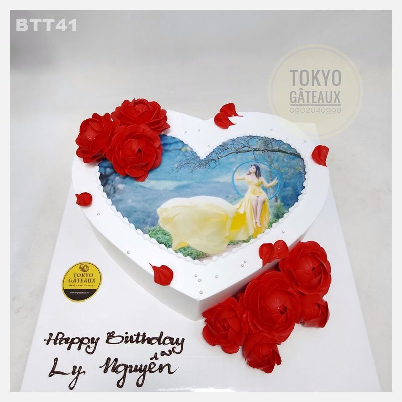 Bánh sinh nhật In ảnh trái tim được trang trí hoa hồng bằng kem tươi một cách vô cùng tỉ mỉ và in ảnh theo yêu cầu khách hàng.