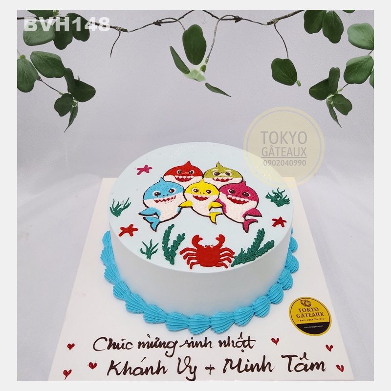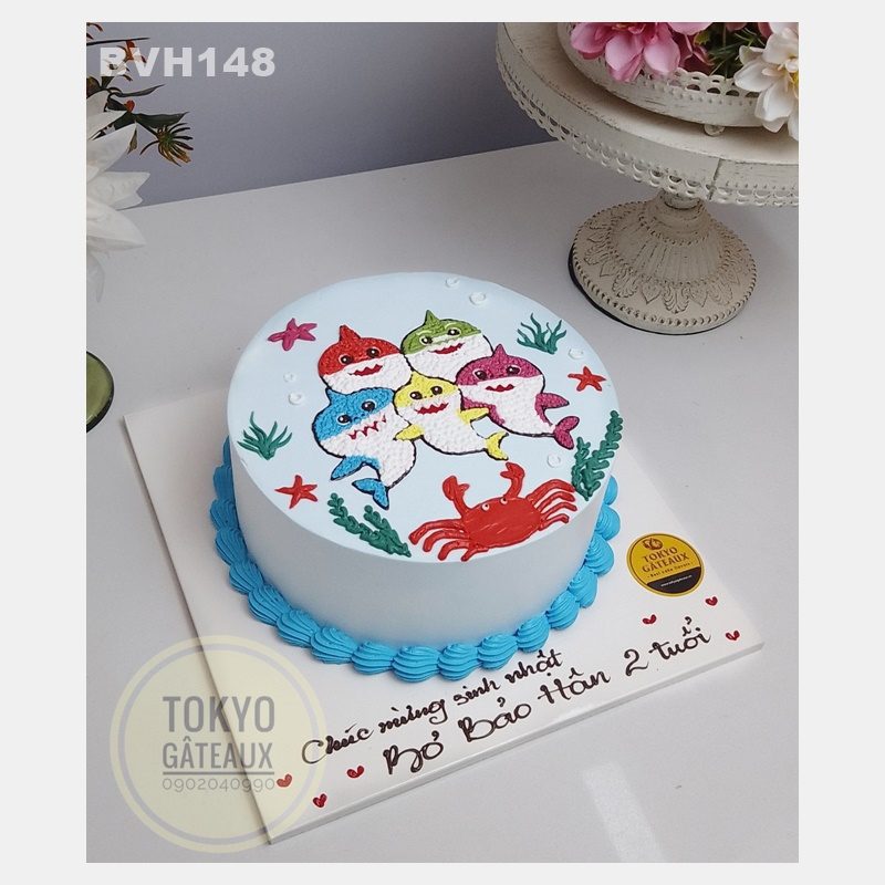 _ Bánh cốt vani, kem tươi, vẽ hình Baby Sharks.