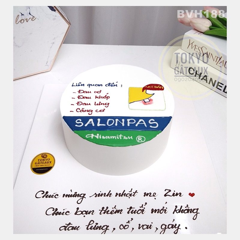 Bánh sinh nhật Salonpas dành cho những người hay bị đau lưng đau bả vai xương khớp. Chiếc bánh được các bạn trẻ hay dùng để nói vui với nhau trong bữa tiệc.