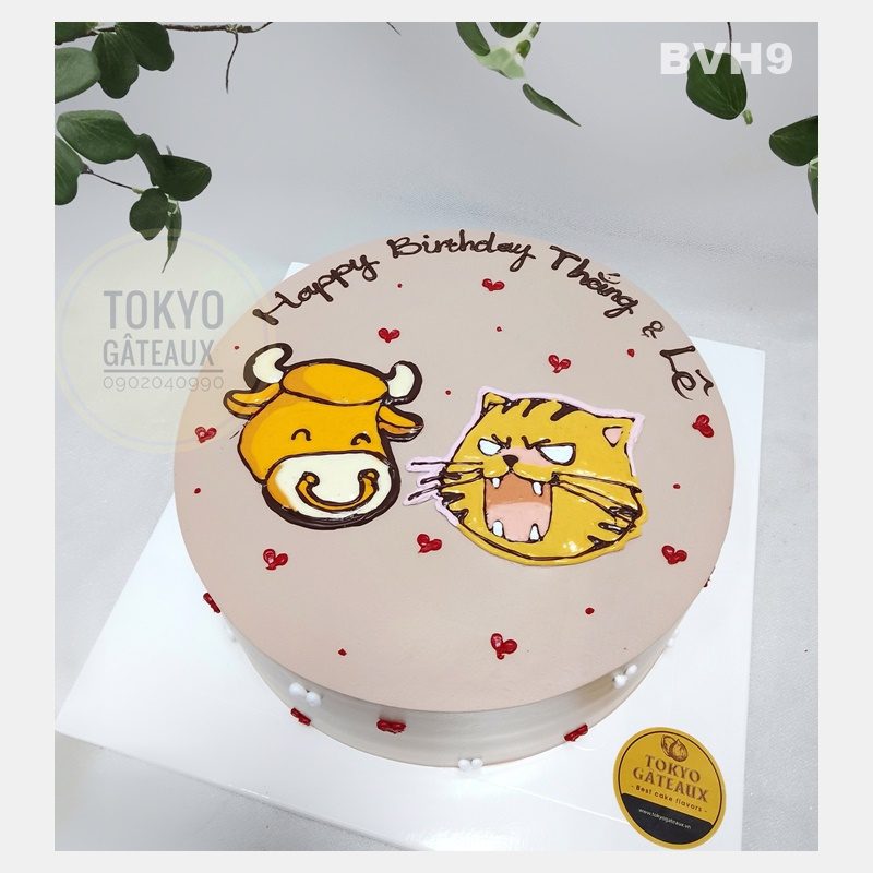 _ Bánh cốt vani, kem socola, vẽ hình trâu và mèo.